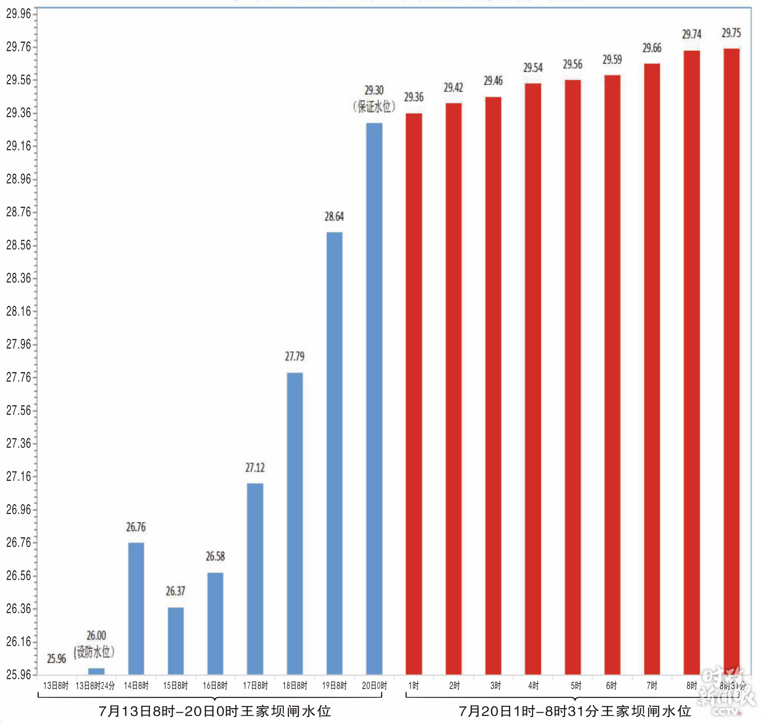 今年7月20日8时30分,王家坝闸水位已达29.75米,超过保证水位0.45米,王家坝闸接到了国家防总开闸蓄洪的命令。