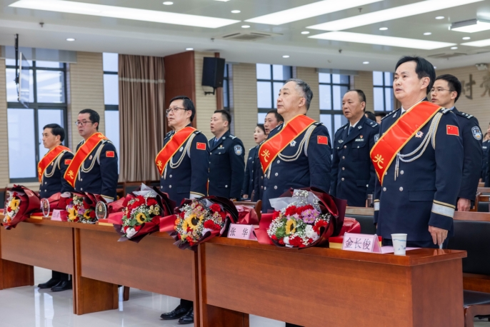 全场起立合唱《中国人民警察警歌》,在豪迈的警歌声中,庄严的荣退仪式落下帷幕。