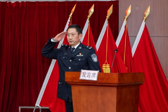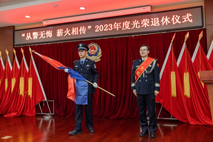 荣退民警傅明庄重地向青年民警代表张子庄递交警旗。