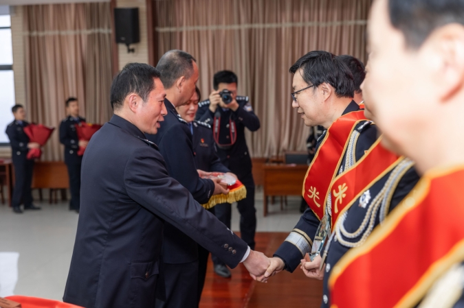 为荣退民警颁发荣誉奖杯,向退休民警献上鲜花。现场持续热烈的掌声是在表达最崇高的敬意和真挚的祝福。