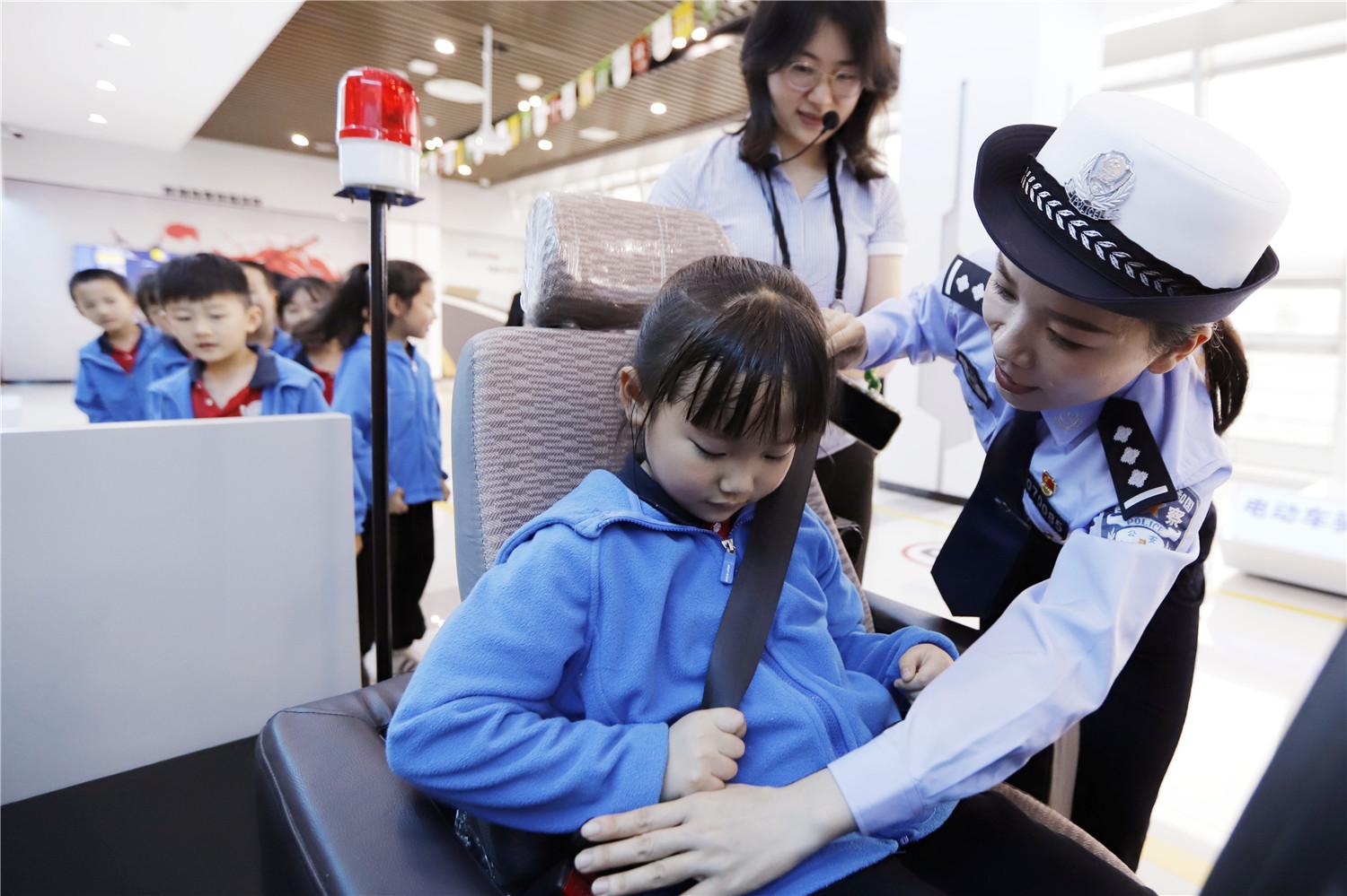 5月30日,小朋友在交警带领下体验模拟安全带防撞系统。当天,芜湖市公安局交警支队鸠江大队民警带领幼儿园小朋友走进该市道路交通安全宣传教育学校,学习“一盔一带”等交通安全知识。本报通讯员 陈效宝 摄