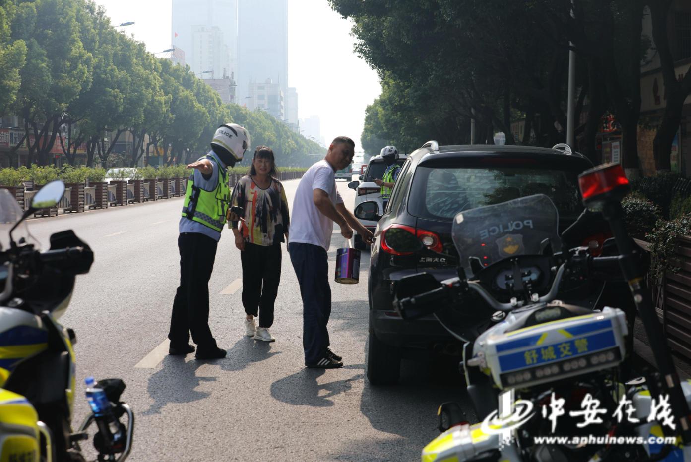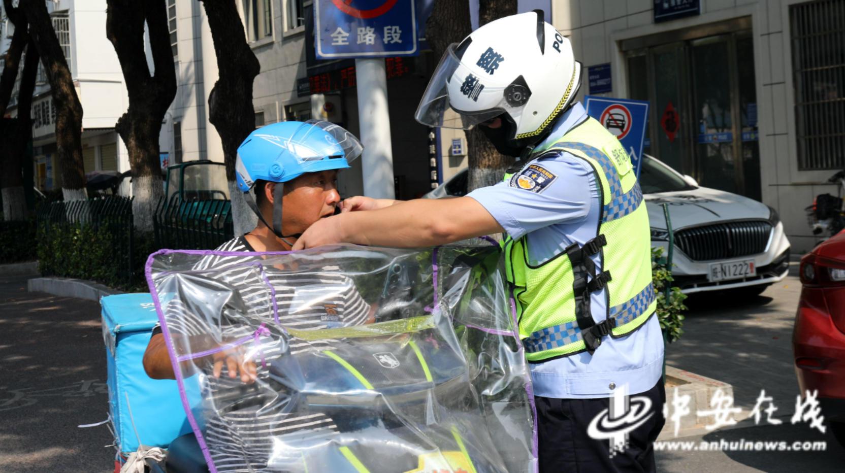 辅警边提醒“外卖小哥”安全头盔正确佩戴技巧边普及交通安全知识。