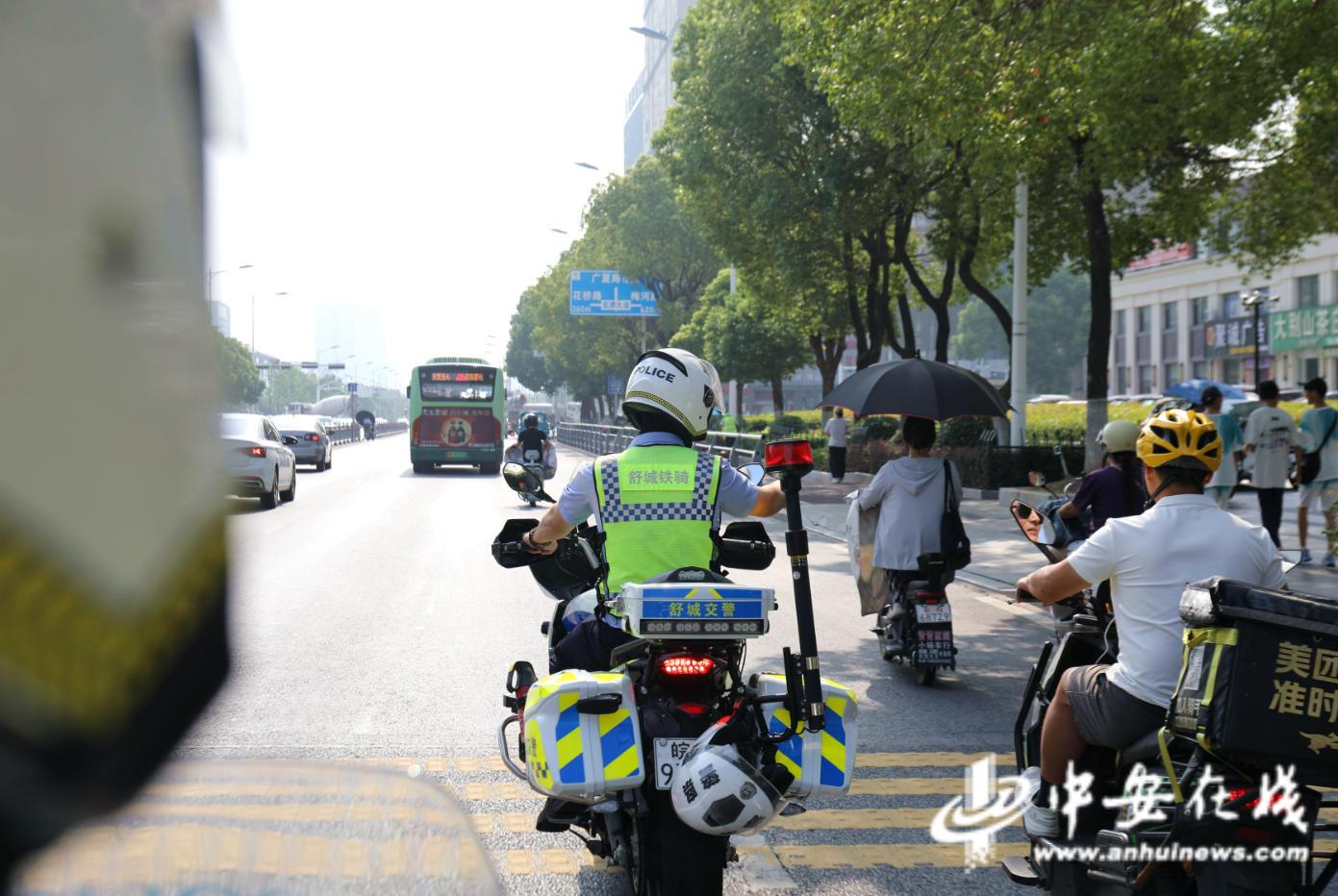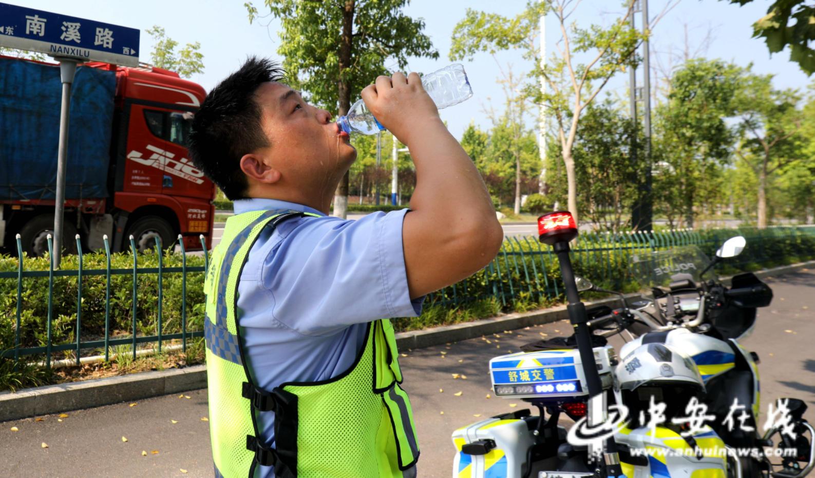 8月5日,安徽省舒城县公安局交管大队铁骑中队民警辅警驾驶警用摩托车以巡逻模式加强动态管控,在各个巡防要道和交通路口控风险、促文明、保平安,被汗水浸透的他们,化身平安“摆渡人”,成了高温炙烤下的真“汗”子,守护道路交通安全畅通。 (王可海 记者 张毅璞)