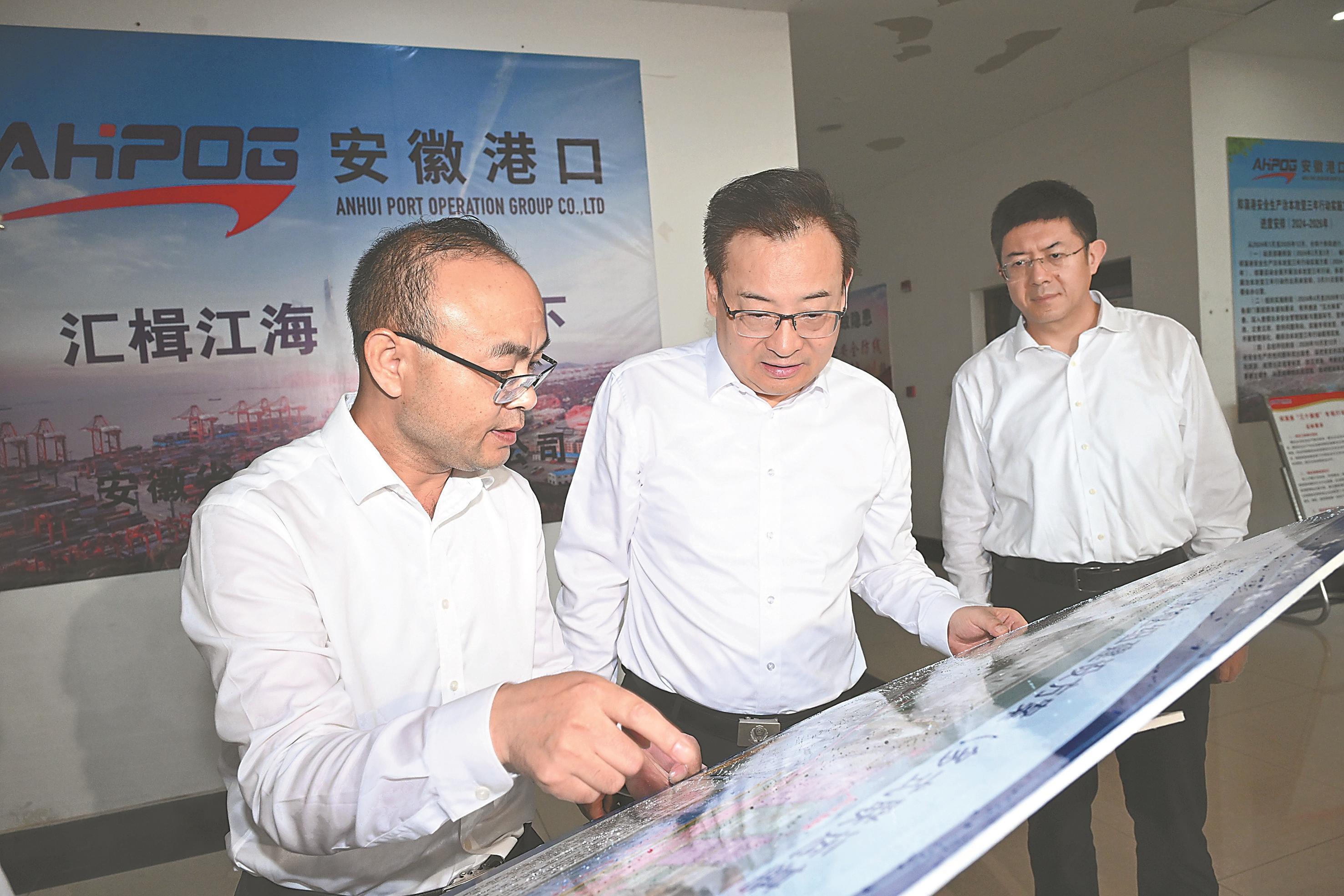 八月十一日,省委书记梁言顺深入马鞍山市郑蒲港港区,详细了解港口规划建设运营情况。本报记者 杨竹 许昊 摄