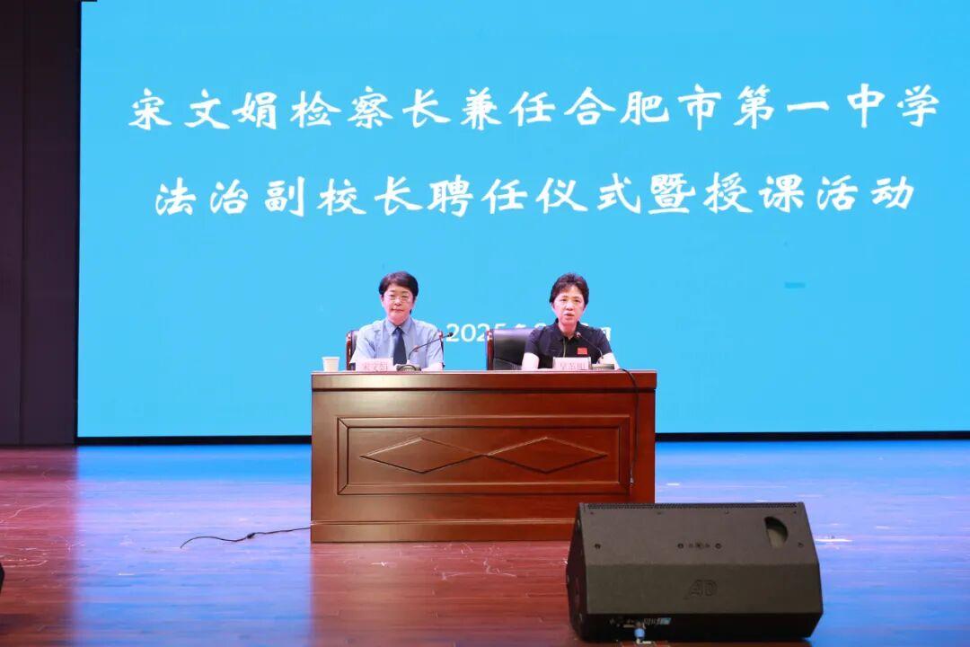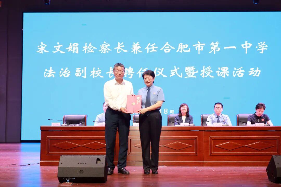 9月8日下午,安徽省人民检察院检察长、二级大检察官宋文娟从合肥市第一中学党委书记封安保手中接过聘书,受聘为合肥市第一中学法治副校长。