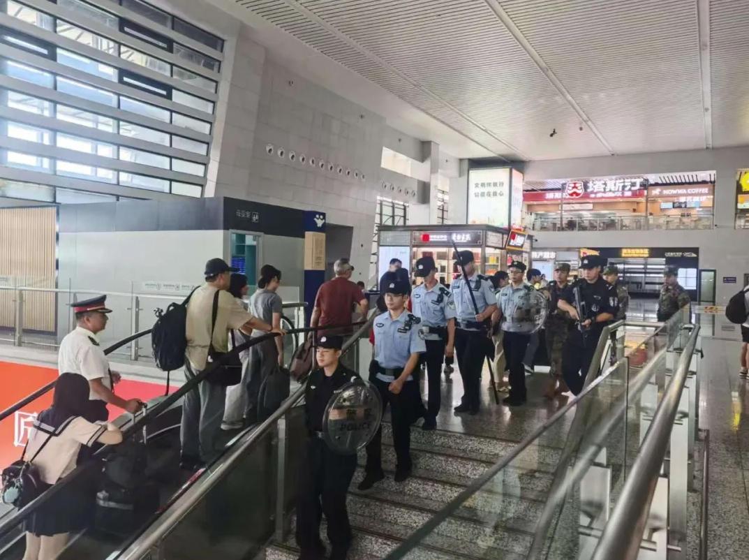 10月8日,随着返程高峰的持续,黄山高铁北站迎来大量旅客。高新公安分局黄山高铁北站警务站民警联合高铁北站派出所、特警和武警等多警种力量,在进站口、出站口及候车大厅等重要区域开展联勤武装巡逻,全面提升见警率,有效维护站区秩序,确保旅客出行安全。