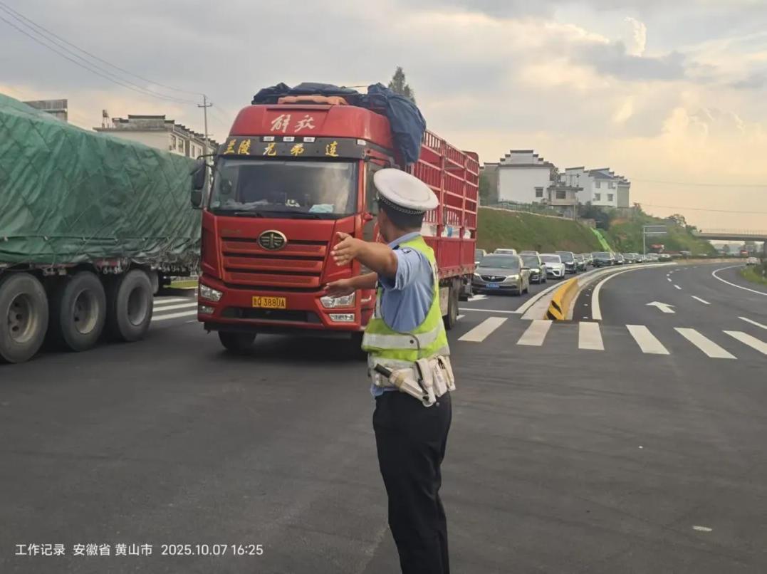 在黄山区、祁门县、休宁县、黟县等地,公安民警辅警坚守一线,在重点路段加强指挥疏导,同时积极为旅客提供暖心服务,用忠诚担当守护平安归途。黄山风景区公安局交管大队民警全力以赴,站好国庆旅游返程最后一班岗,用实际行动护航游客出行安全。
