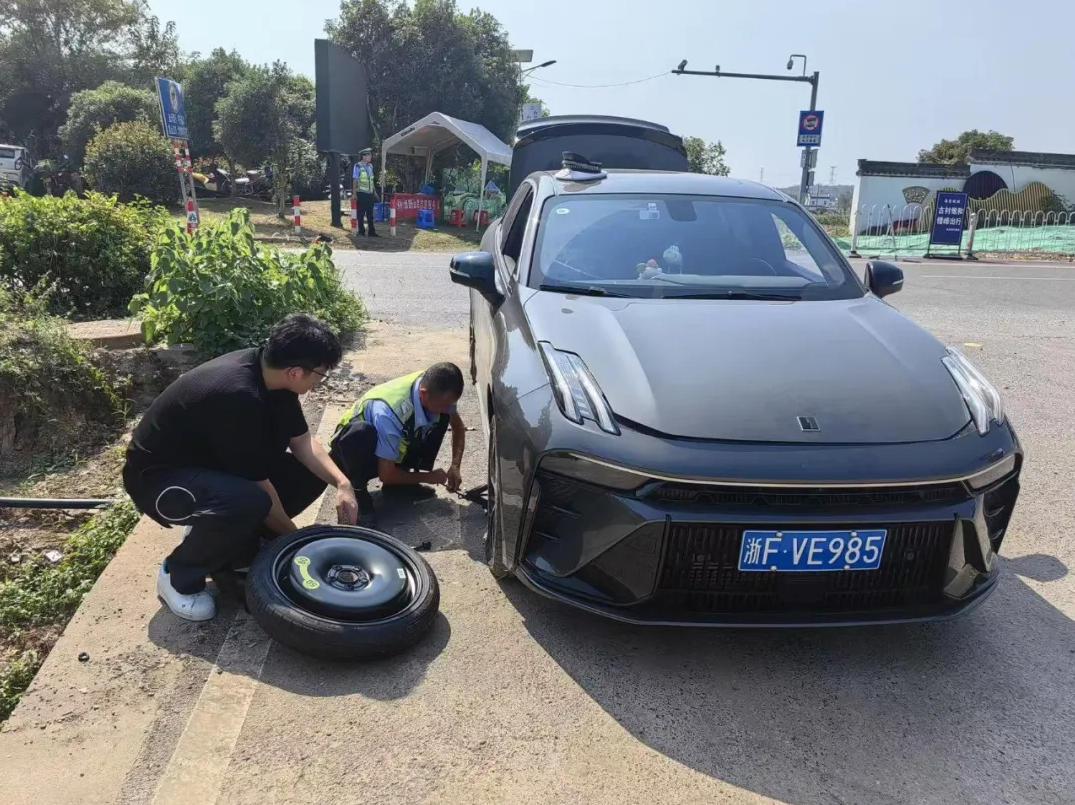 返程途中,暖心警事不断上演。10月7日上午,在岩寺高速口,一辆轿车因撞到路牙石导致爆胎,驾驶员焦急万分。正在执勤的徽州公安分局交管大队民警辅警发现后立即上前援助,民警辅警熟练操作,迅速帮助更换备胎,并贴心提醒驾驶人备胎仅能临时使用,需尽快前往修理厂检修。驾驶人对民警的热心帮助连声道谢。
