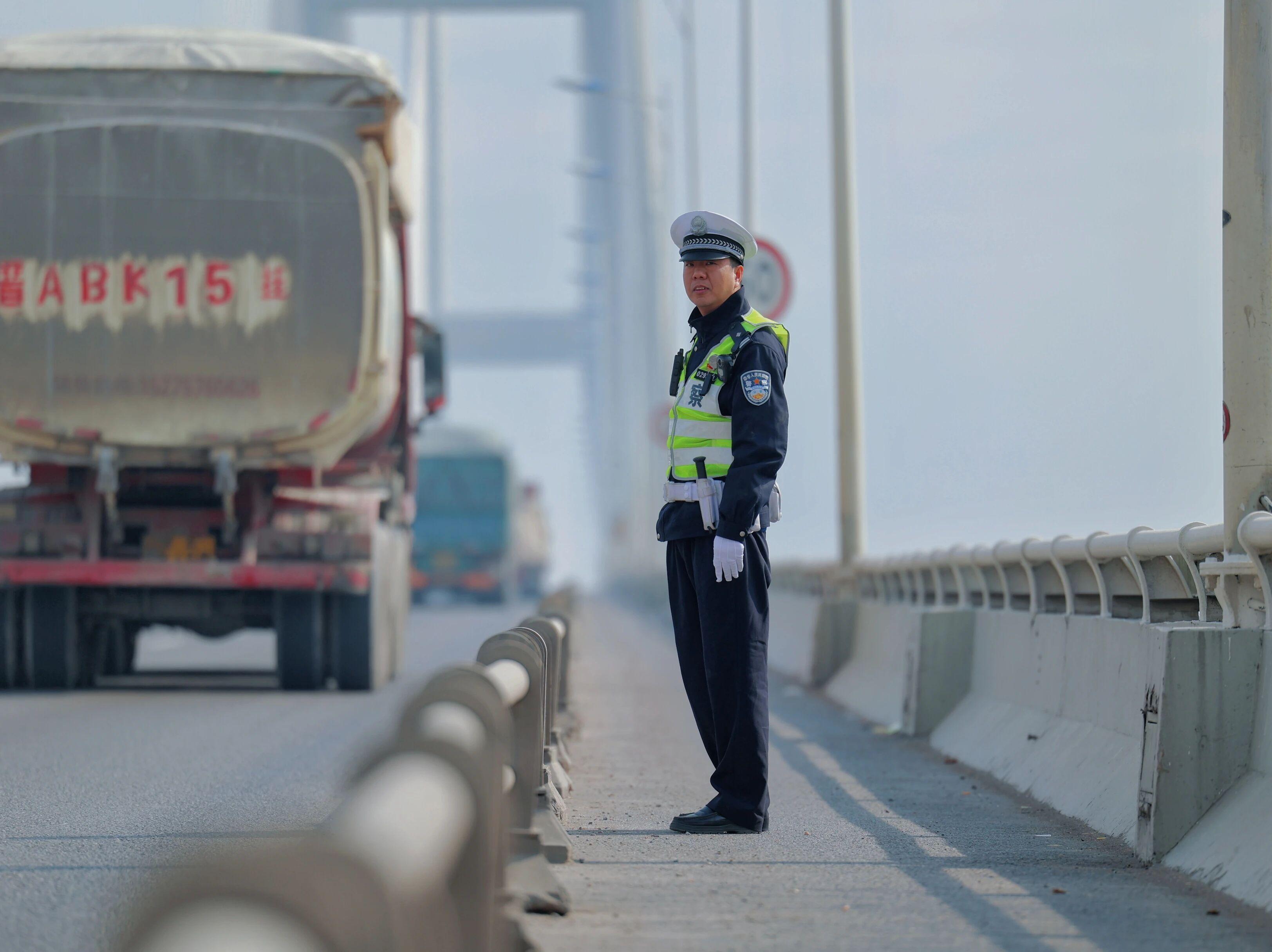 “北引桥车流平稳,桥面目前通行正常。”对讲机里传来同事的话语,鲍汇江收回思绪,快步走向车流间,他左臂伸直指向来车方向,右臂不断摆动示意车辆或减速或变道,嘴里的哨子节奏分明。这组动作,在这座大桥上重复了无数次,久而久之便成了肌肉记忆。